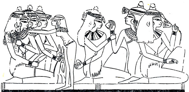 Служанки и слуги сновали между гостями, раздавая цветы и благовония. Служанки всегда были молоды и красивы. Прозрачные одеяния не скрывали их прелестей. Чаще всего на них вообще ничего не было, кроме ожерелья и пояска. Все мужчины и женщины получали по цветку лотоса, а затем каждый водружал на голову белый колпачок. Служанки делали эти украшения из волос, обмазанных ароматным маслом, которое черпали из большой чаши. Хозяева дома, их дочери и служанки имели на голове это украшение, обязательное для торжественных приемов. Именно на него намекает автор восхваления, процитированного выше: "Твой хранитель благовоний раздает смолистые ароматы". Без благовоний не может быть радости! К тому же они отбивали запахи пива, вина и жаркого. Служанкам эти маленькие конусы на голове, по-видимому, нисколько не мешали. Художники, которые никогда не упускали случая изобразить даже в гробнице какой-нибудь смешной или нелепый эпизод, ни разу не показали, чтобы это благовонное украшение свалилось у кого-нибудь с головы. Водружая его, служанки ловкой рукой поправляли нагрудное ожерелье гостя.