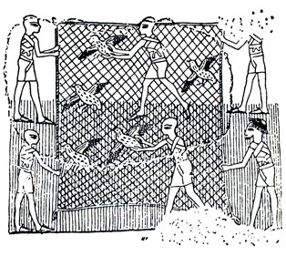 В период миграции перепелки прилетают в Египет тучами. Они настолько устают после долгого перелета, что падают на землю. Разумеется, египтяне предпочитали ловить здоровых птиц. Рельеф, хранящийся в Берлинском музее, показывает нам шестерых охотников с мелкоячеистой сетью, натянутой на деревянную раму. Обращает на себя внимание костюм охотников. Они обуты в сандалии, чтобы ходить по жнивью, и подпоясаны белыми платками. Когда стаи перепелов появляются над сжатым полем, охотники вскакивают и начинают размахивать своими белыми платками, вызывая среди птиц панику: растерянные перепела начинают метаться и в конце концов попадают в сеть, запутываются лапками в мелких ячейках, мешают друг другу и не могут вовремя высвободиться. Четверо охотников осторожно поднимают раму с сетью, а двое выбирают из нее пойманных перепелов*.