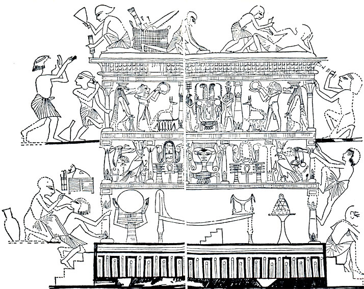 Мастера, изготовившие эти два парадных наоса, были настоящими акробатами. Тем, кто вырезал иероглифы на двух больших колоннах, не приходилось даже вставать на цыпочки, но зато двоим другим, украшавшим карниз, пришлось взбираться со своими инструментами по колоннам. Вот один из них поставил ногу на выступ под сводом, другой взобрался на свод, и оба, держась одной рукой за урея на карнизе, другой орудуют киянками. На этом втором наосе неожиданный приход надсмотрщика застал мастеров врасплох: один сидит внизу и ничего не делает, другой быстро взбирается по колонкам, стараясь уйти подальше от глаз представителя власти. На противоположной стороне художник в шутку разрисовывает красками лицо соседа, но тот лишь смеется. Надзиратель проходит мимо них, ничего не замечая, потому что все его внимание обращено на столяра, который сладко спит, растянувшись перед своей неоконченной работой. Он кричит на него. Один из мастеров, балансировавших на верхнем этаже, от неожиданности теряет равновесие. А на самом верху двое других поспешно хватаются за инструменты. Один сверлит дырку, другой полирует дерево, а третий, внизу, расталкивает спящего. В древнем Египте отдавали предпочтение "бригадной работе", но, чтобы такая работа была эффективной, требовались многочисленные надсмотрщики с зорким глазом и богатым словарем, не стеснявшиеся пустить в ход палку, а также надсмотрщики над надсмотрщиками.