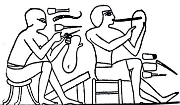 Другая специализация столяров - производство луков, стрел и дротиков, царских инсигний для фараона и других знаков власти для знатных особ, высших жрецов, военачальников и чиновников, а кроме того, изготовление музыкальных инструментов*. Луки делали иногда совершенно прямые, иногда изящно изогнутые и не подверженные деформации. В мастерской Менхеперрасенеба мы видим, как мастер испытывает лук, а его сосед взвешивает на ладони стрелу и проверяет, достаточно ли она прямая. Для того чтобы придать ветке нужный изгиб, ее предварительно нагревали, не снимая коры, и закладывали в примитивный зажим, состоявший из врытого в землю столба с развилиной, две ветви которого стянуты прочной веревкой. Нагретую ветку закрепляли в этом зажиме и придавали ей нужный изгиб с помощью дополнительного рычага**.