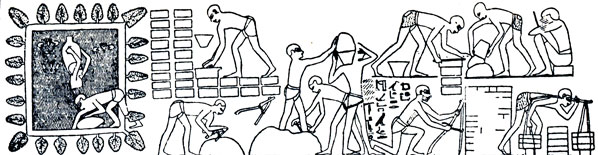 Египетский каменщик занимался прежде всего формовкой и кладкой необожженных кирпичей. Весь город окружен стеной толщиной около пятнадцати метров и высотой метров двадцать. Только ворота в ней каменные, а вся стена - из кирпича-сырца. Административные здания и частные дома тоже сложены в основном из кирпича: камня в них мало, так же как в оградах. Когда Рамсес II задумал построить свой любимый город Рамсес, который египтяне чаще называли Пер-Рамсес, и государственные склады в Питоме, он собрал сынов Израилевых, назначил над ними надсмотрщиков и под угрозой страшных наказаний заставил их формовать кирпичи*. Работа была монотонной, но не такой уж трудной. Нильский ил перемешивали с песком и рубленой соломой. Чтобы смесь получалась однородной, ее смачивали, долго топтали и время от времени переворачивали лопатой. Работник наполнял этой сырой смесью форму доверху, срезал излишек деревянной лопаткой, быстро переворачивал форму и осторожно снимал. Кирпич оставляли сохнуть восемь дней, после чего он годился в дело. Формовщики работали преимущественно на берегу водоема. Водоносы подносили им воду. Другие работники срезали на сжатых полях стерню и готовили из нее рубленую солому. Когда фараон потребовал, чтобы сыны Израилевы сами собирали солому, не уменьшая установленной нормы отформованных кирпичей, это сильно ухудшило их и без того нелегкую участь, однако протесты приводили только к тому, что на их спины обрушивались палки надсмотрщиков. Переносили кирпичи на двух одинаковых щитах, подвешенных на коромысло.