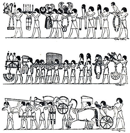 А в остальном погребальная процессия весьма напоминала переселение из одного дома в другой*. Первая группа служителей несла на коромыслах пирожки и цветы, глиняные кувшины и каменные вазы, ларцы со статуэтками-ушебти и их орудиями труда. Вторая, более многочисленная группа несла обычную погребальную мебель: кресла, кровати, ларцы и шкафчики, а кроме того - колесницу в разобранном виде. Личные вещи, ящики с канопами, трости, скипетры, статуи, зонты были доверены третьей группе носильщиков. Драгоценности, ожерелья, фигуры соколов или коршунов с распростертыми крыльями, птиц с человеческими головами и другие предметы роскоши несли на блюдах и явно выставляли напоказ, не опасаясь многочисленных зевак, наблюдавших за шествием. Саркофага почти не было видно на катафалке, который тащили две коровы; несколько мужчин подталкивали его. Этот катафалк состоял из деревянных раздвижных щитов или рамок, занавешенных вышитыми тканями или кожей. Он покоился на ладье со статуями Исиды и Нефтис с обеих сторон, а сама ладья стояла на санях с полозьями.